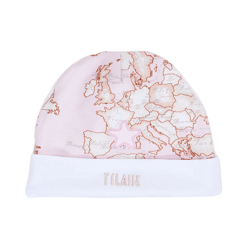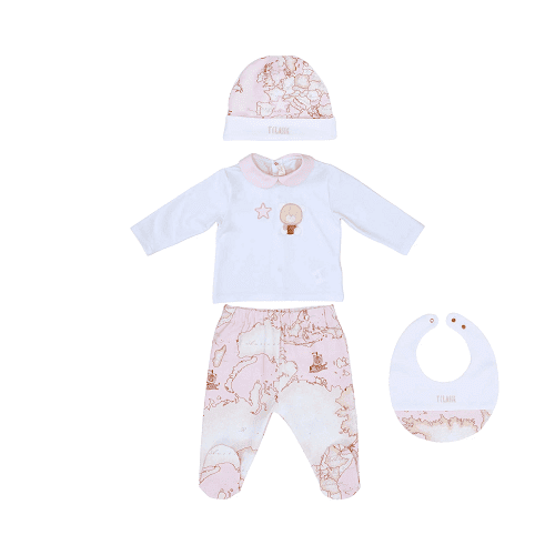 Pink sleepsuit, hat and bib set for girls by luxury Italian designer Alviero Martini, made in soft cotton jersey.