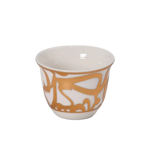 Comprehensive 13-Piece Collection: Features 6 traditional white porcelain cawa (coffee) cups, 6 smoke-tinted tea glasses with handles, and 1 coordinating gold-patterned saucer.