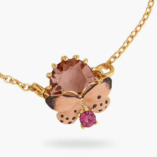 A delicate and graceful bracelet featuring a white butterfly hand-enamelled with exquisite detail, set upon a fine gold-plated brass chain. Two round crystals in soft purple hues add a touch of sparkle, while the pastel tones and semi-transparent enamel create a light, ethereal charm. An elegant piece that evokes the gentle flutter of butterflies in a serene, airy atmosphere.