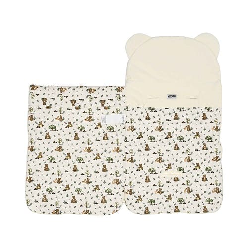 Warmly padded for extra coziness, it features a subtle tonal logo patch on the front and adorable 3D teddy bear ears on the hood, adding a playful Moschino touch. The interior is lined with smooth cotton jersey printed with a charming forest-themed motif — including the signature Moschino Teddy Bear alongside a baby deer.