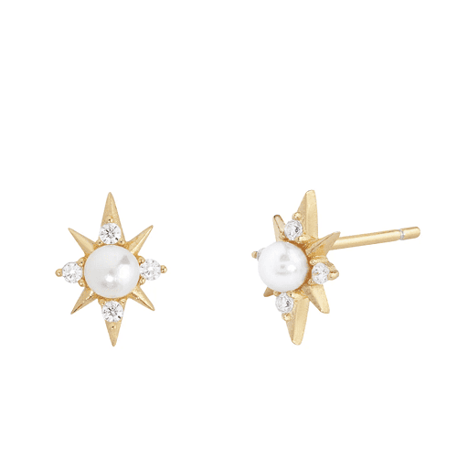 The Shashi Celestina Pearl Stud Earring is crafted from vermeil on sterling silver, creating a stunning and luxurious accessory.