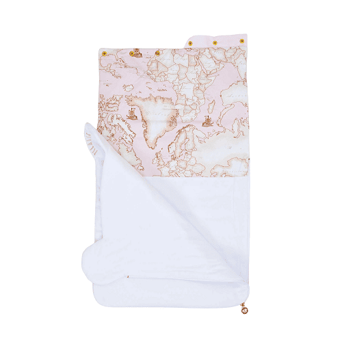 The hood is lined with the signature Geo map print in a soft pink and beige palette, enhancing its stylish and travel-inspired aesthetic.
