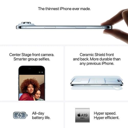 The thinnest iPhone ever. 16.63 cm (6.5″) display, durable Ceramic Shield front and back, A19 Pro chip, 48MP Fusion camera system, and Center Stage front camera.