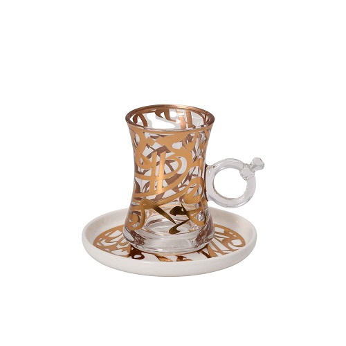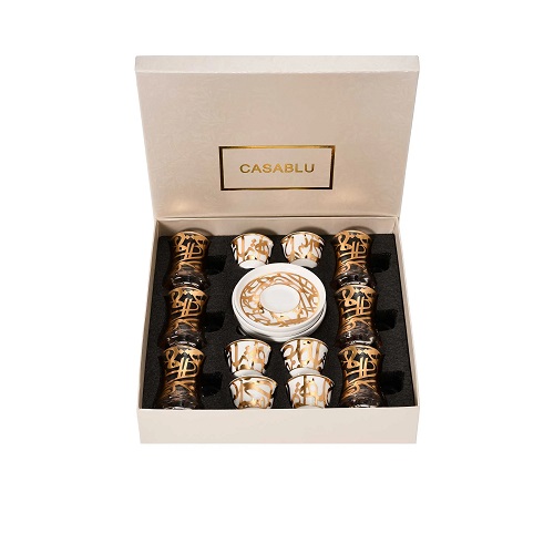 Comprehensive 13-Piece Collection: Features 6 traditional white porcelain cawa (coffee) cups, 6 smoke-tinted tea glasses with handles, and 1 coordinating gold-patterned saucer.