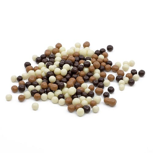 It is a mix of pearl shaped chocolates in dark, milk and white chocolate coated around a tiny toasted biscuit.