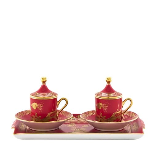 Elevate your coffee experience with this elegant set, featuring red porcelain espresso cups with lids, saucers, and a matching platter.