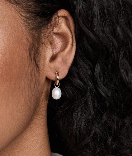 A timeless expression of understated elegance, the Jasmin Huggie showcases a sleek gold hoop adorned with a luminous pearl drop.